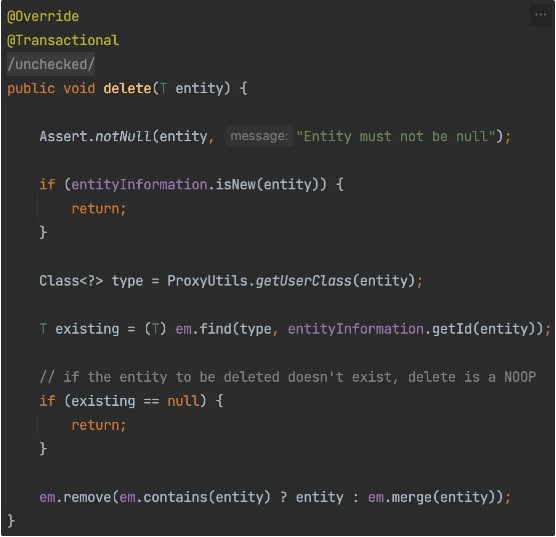 delete 메서드를 이용해 해당 Entity를 테이블에서 삭제할 수 있다.