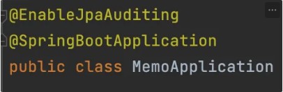 해당 기능을 사용하기 위해서는 @SpringBootApplication이 설정된 클래스에 @EnableJpaAuditing을 추가해야한다.