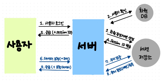 5) 클라이언트의 요청에 쿠키가 있다면 서버는 세션저장소에서 쿠키를 검증한다.