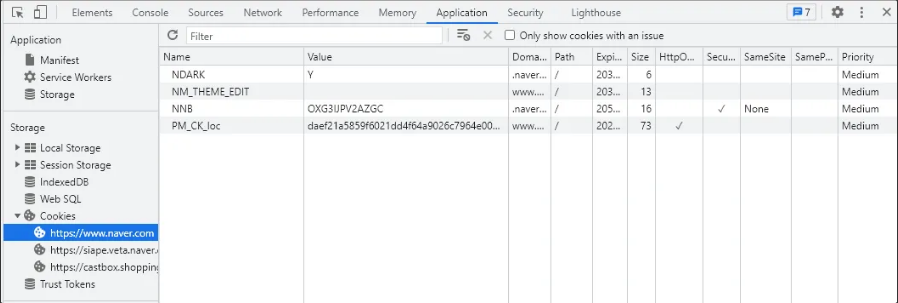 브라우저 > F12(개발자도구) > Application > Storage > Cookies 에 도메인 별로 저장되어 있다.